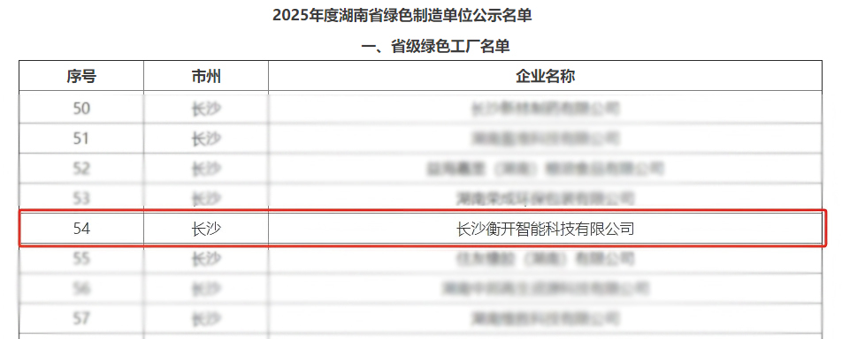 近日,湖南省工业和信息化厅正式公示 2025 年度湖南省绿色制造单位名单。其中,长沙衡开智能科技有限公司凭借在绿色制造领域的深耕实践与突出成果成功入选,跻身 “湖南省绿色工厂” 行列。