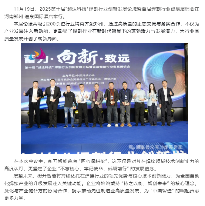 喜讯!衡开智能参加第十届“越达科技"焊割行业创新发展论坛暨首届焊割行业贸易展销会荣获匠心深耕奖